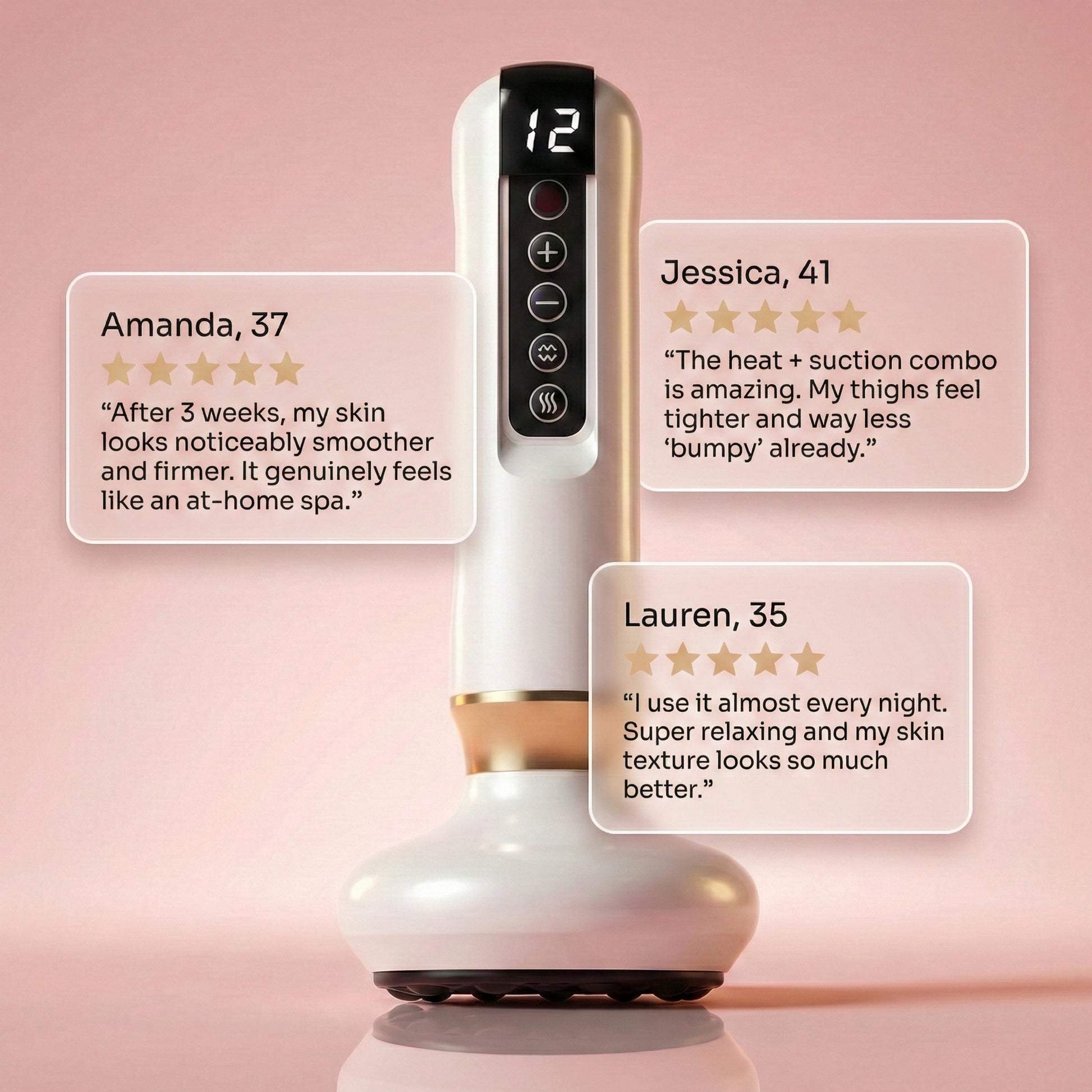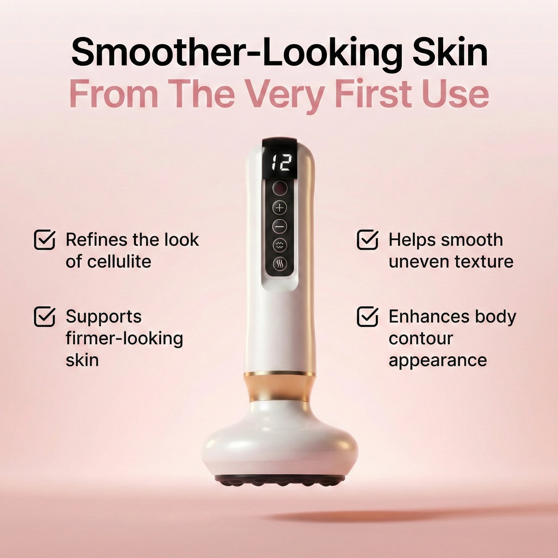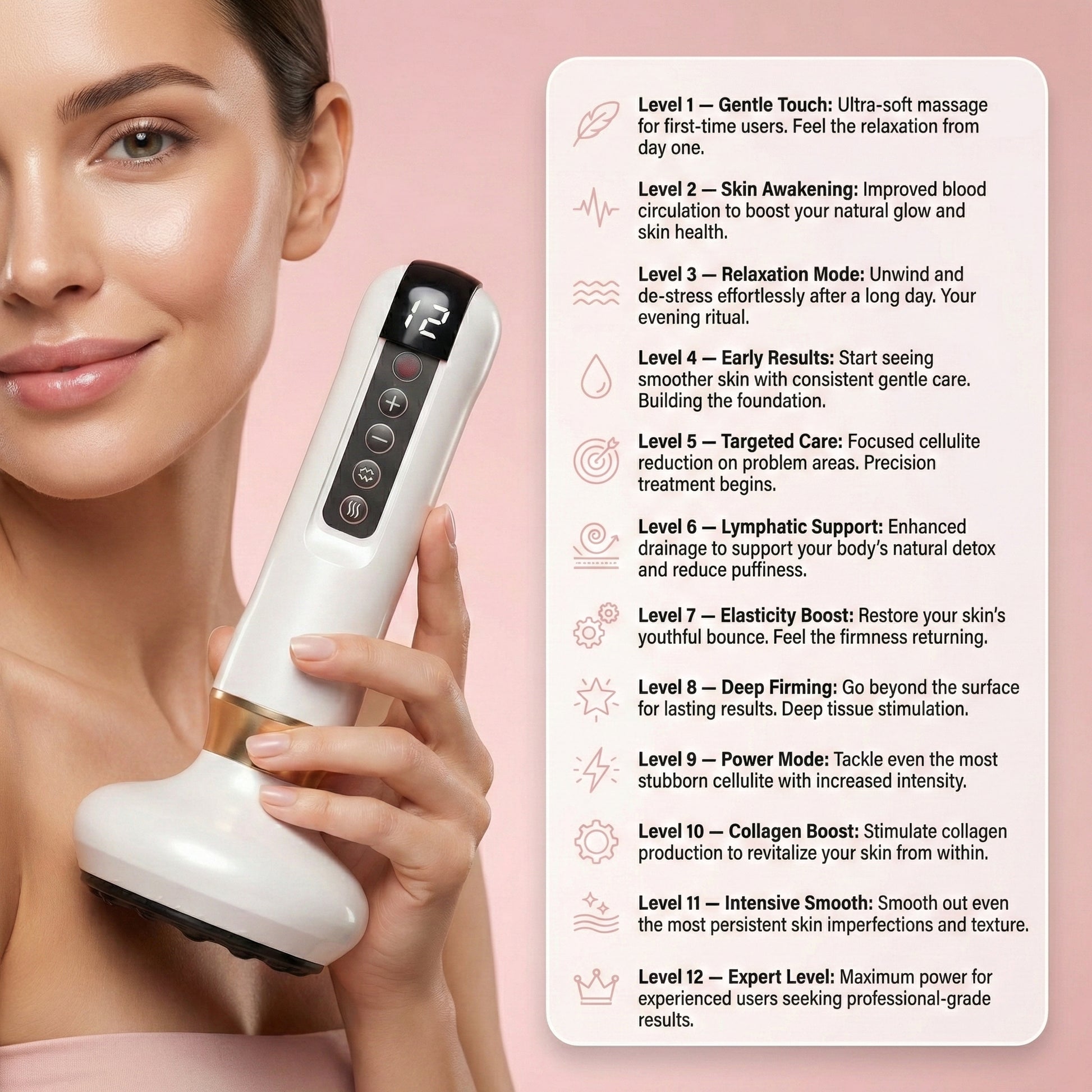 Smoother, firmer skin with consistent daily use — just 10 minutes a day. No creams, no spa visits.